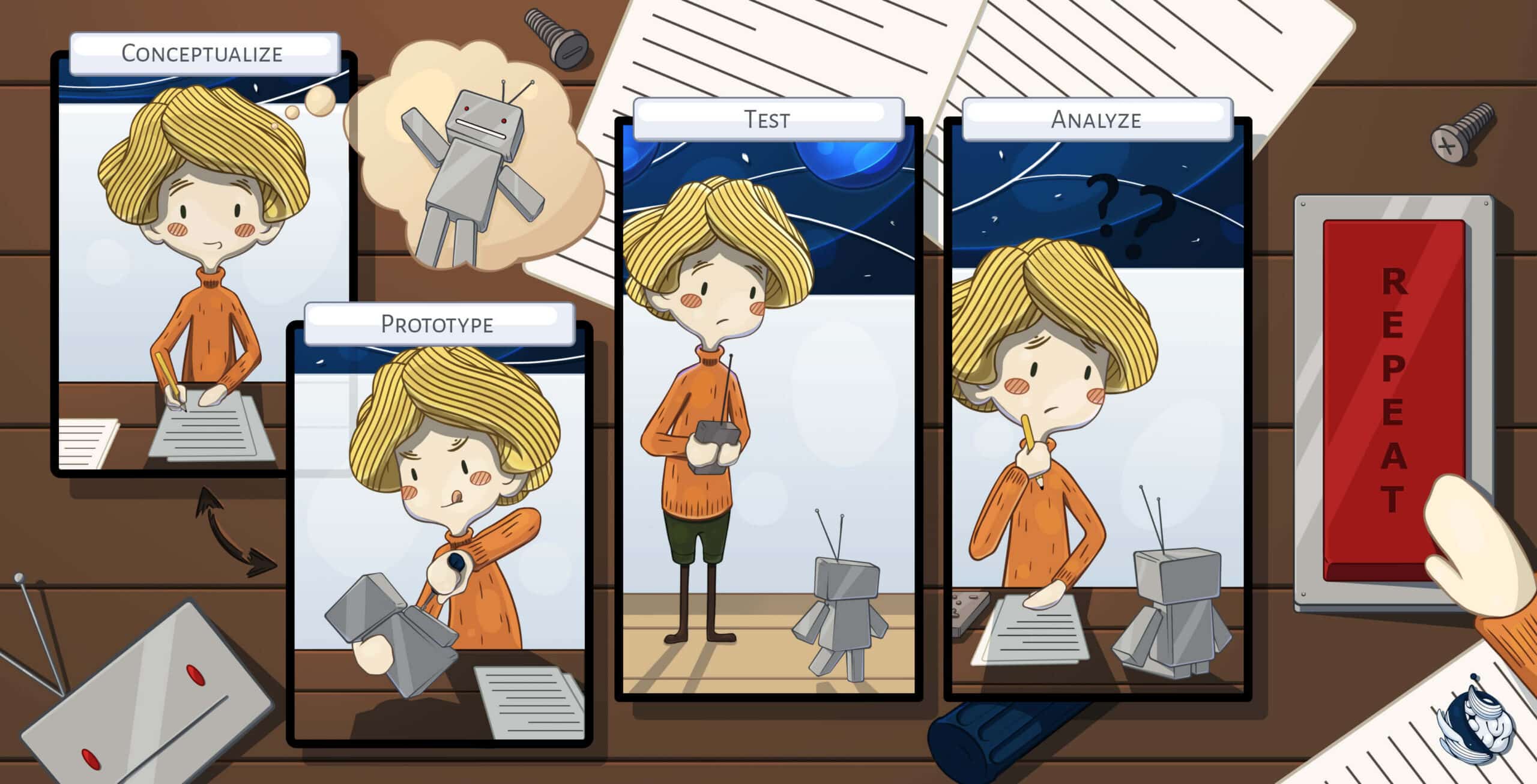 The Iteration Cycle is rooted in the scientific method (when we’ll dive into the steps, you’ll realize this similarity more clearly). Scientists learned to always treat failure as an opportunity to improve, especially if it happens in a project’s early stages. If you adopt this mindset you can enjoy experimentation without the fear of mistakes. This way failure becomes a guide and also builds up the motivation to cover holes in your game. Every veteran game designer seek earlier mistakes because they can make many problems visible and fix them to avoid growing bigger and blowing up everything down the road.